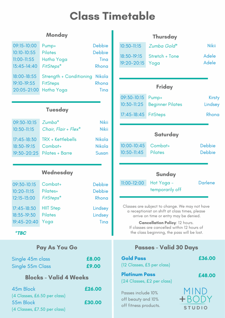 View our latest timetable, which is powered by Gymcatch, to give you real-time up to date classes and easy booking. Our classes include Pilates (Mat & Reformer), Yoga, dance based fitness, Strength & Toning and Cardio based classes. At all levels, and with different options, we have something for everyone. You can also find the link to our on-demand class library, class prices and a photo version of our full timetable at the bottom of this page.